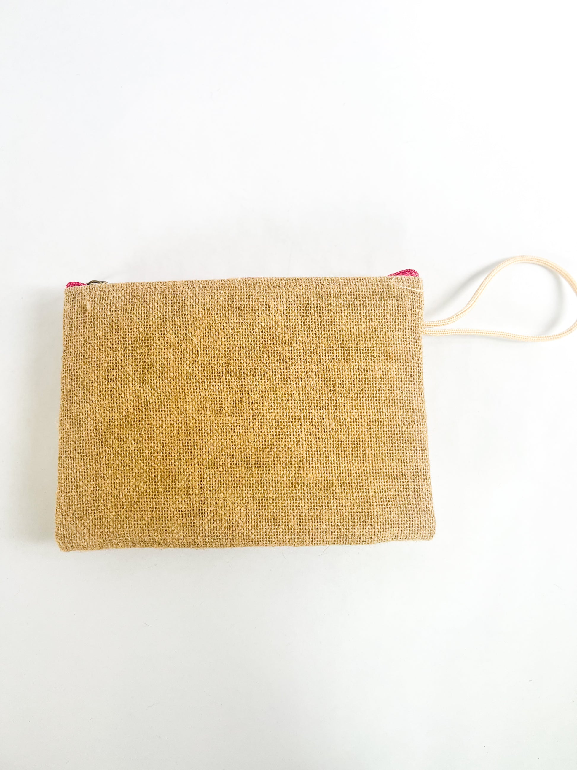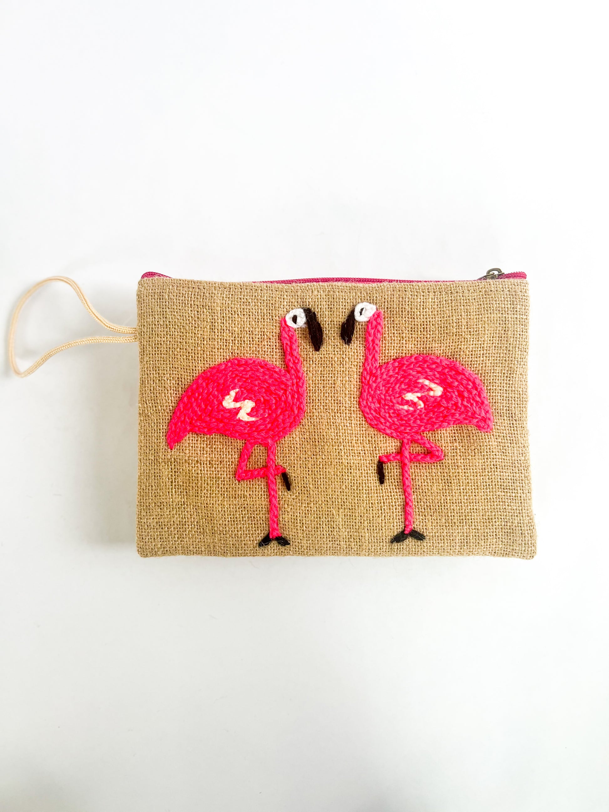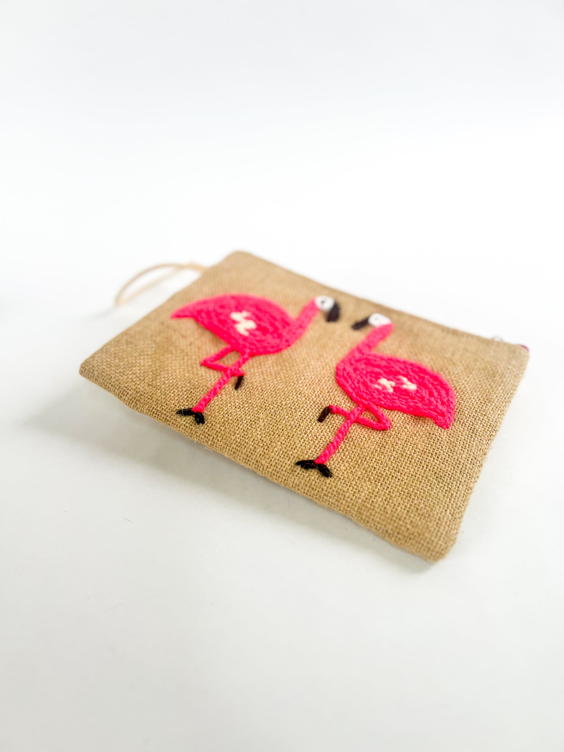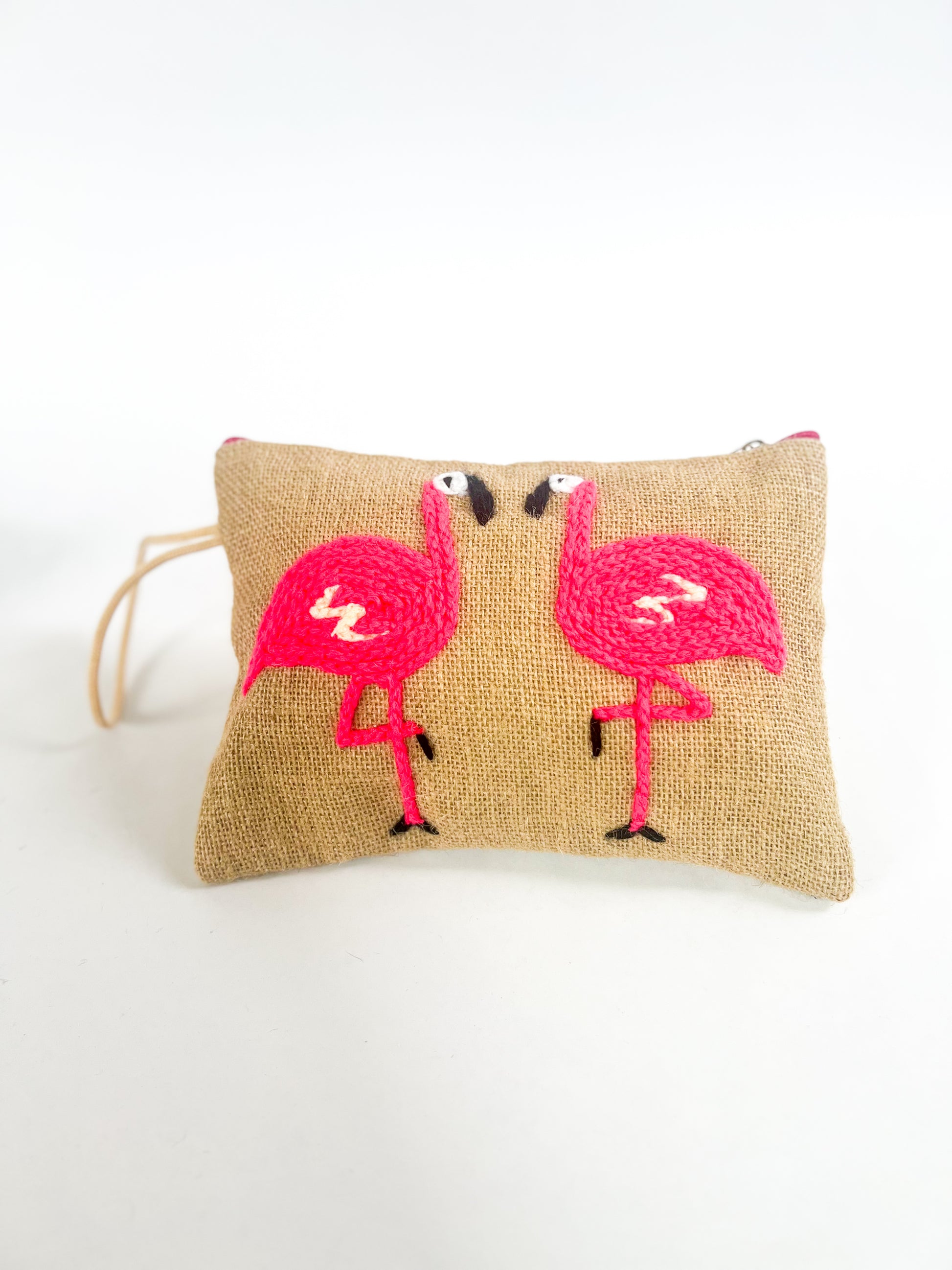 Embrace the handmade coolness with our burlap "Flamingo" wrist bag. Whether you're strolling through the city or seeking a whimsical accent that holds your essentials, this bag has you covered. Stand out from the ordinary with this one-of-a-kind, playful bag.