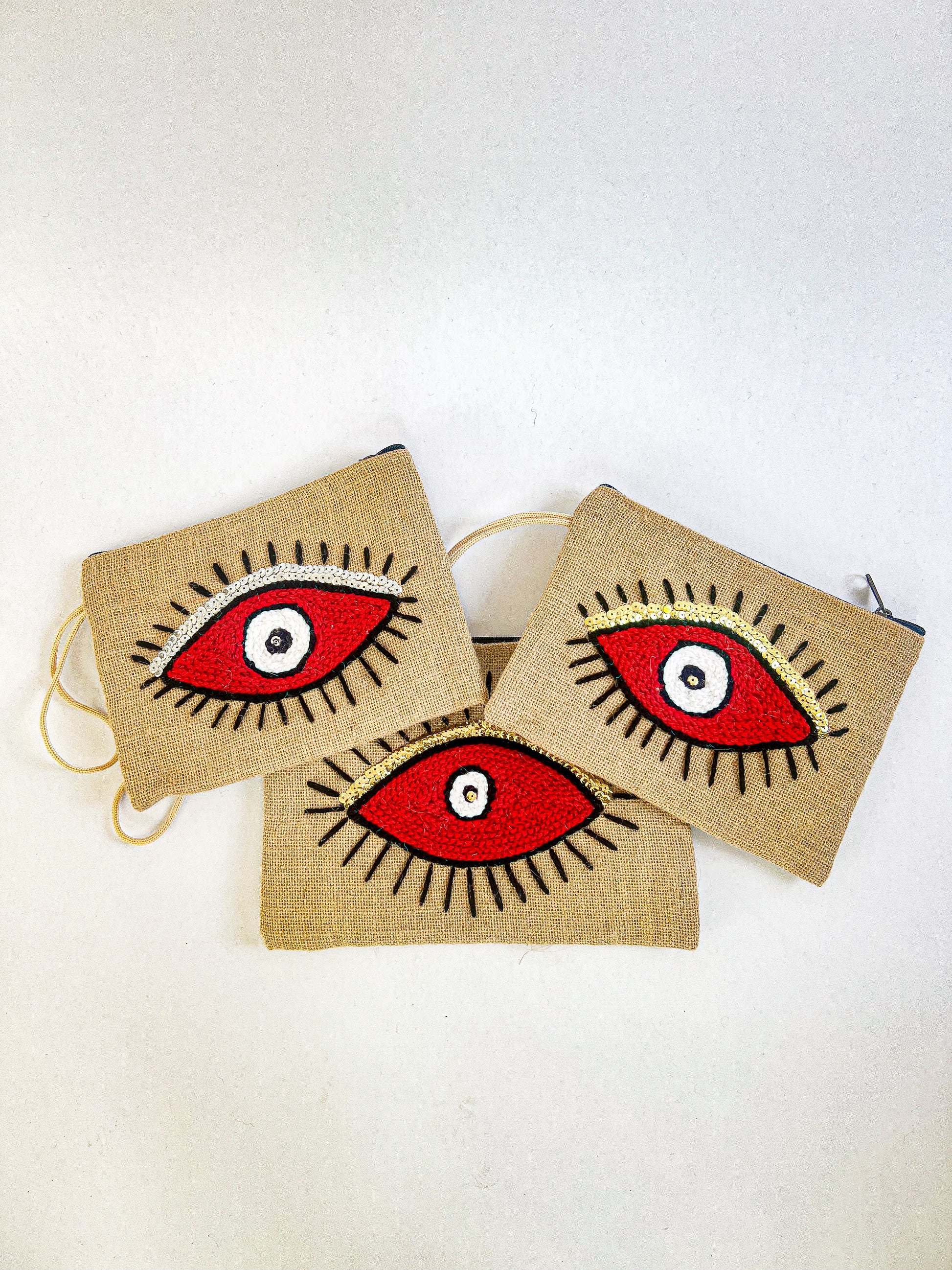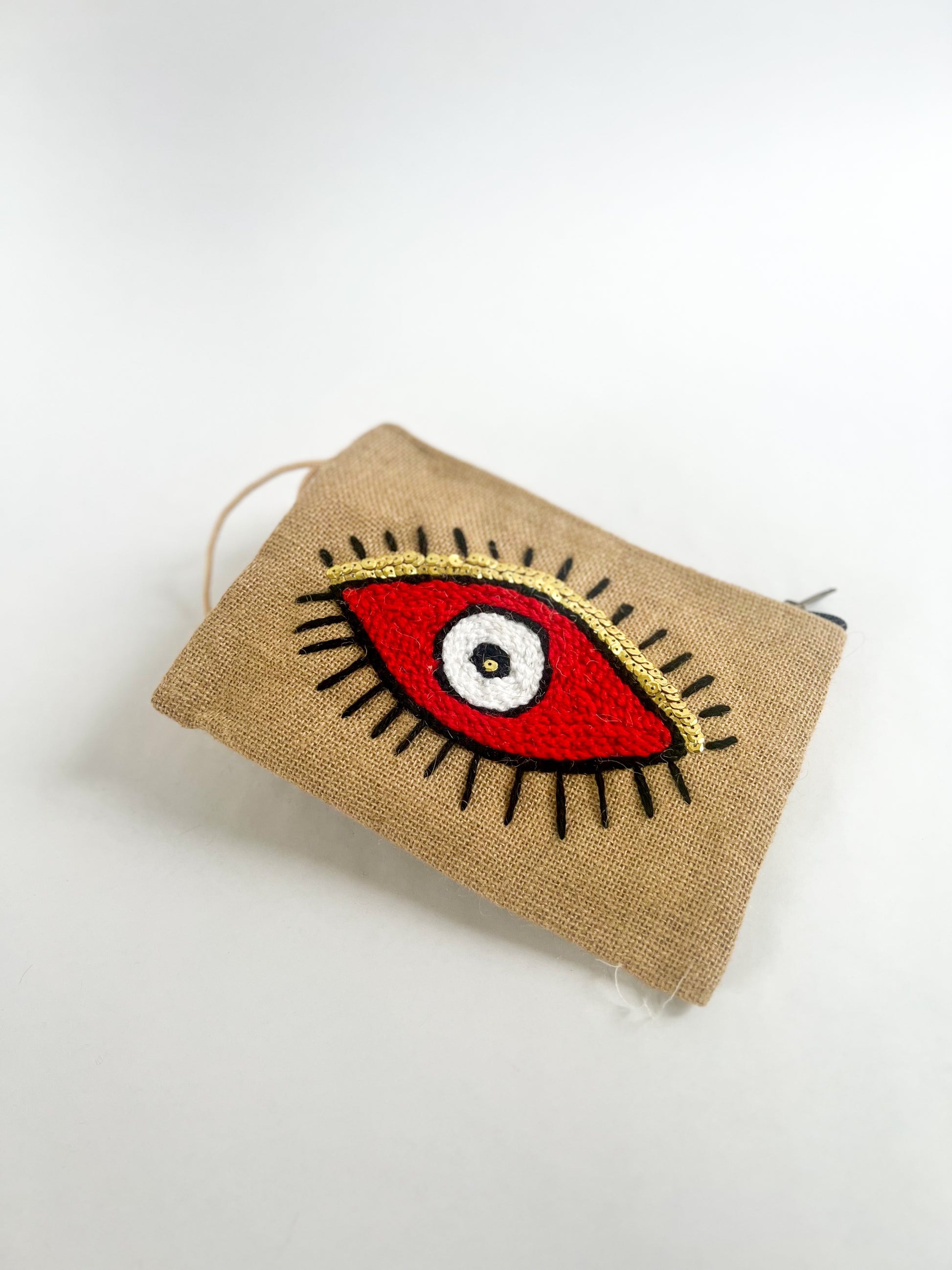 Elevate your style with our luxurious handmade burlap red "Evil Eye" wrist bag. This chic accessory exudes an effortless coolness and is the perfect addition to any outfit. Make a statement and showcase your playful side, while also keeping negative energy at bay. Holds your essentials like phone, wallet, and makeup.