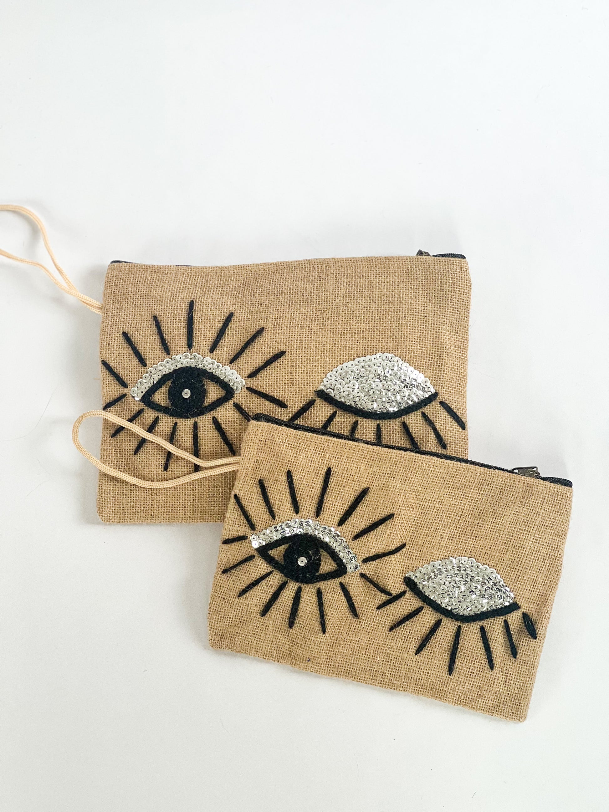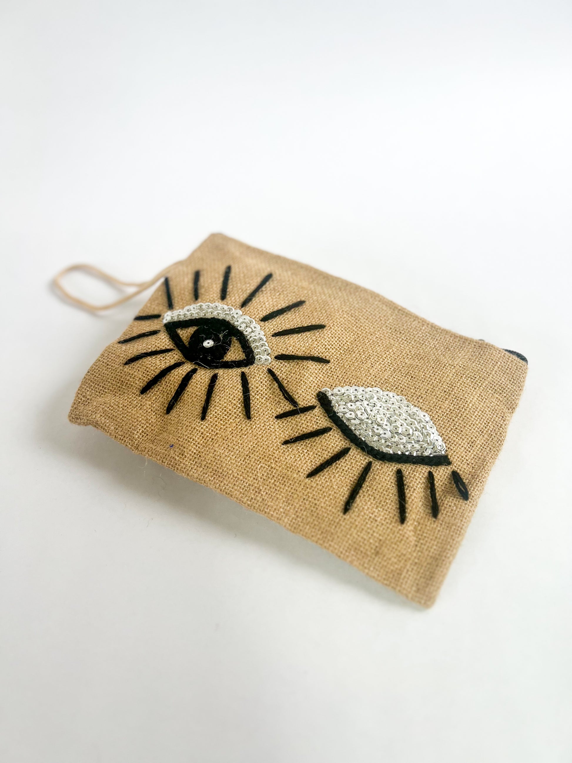 Discover our unique burlap silver "Wink" wrist bag - handcrafted with a chic aura that sets you apart. Elevate your essentials with sophistication and add a playful flair to your ensemble. Embrace this fashionable accessory that effortlessly carries your must-haves on the move.