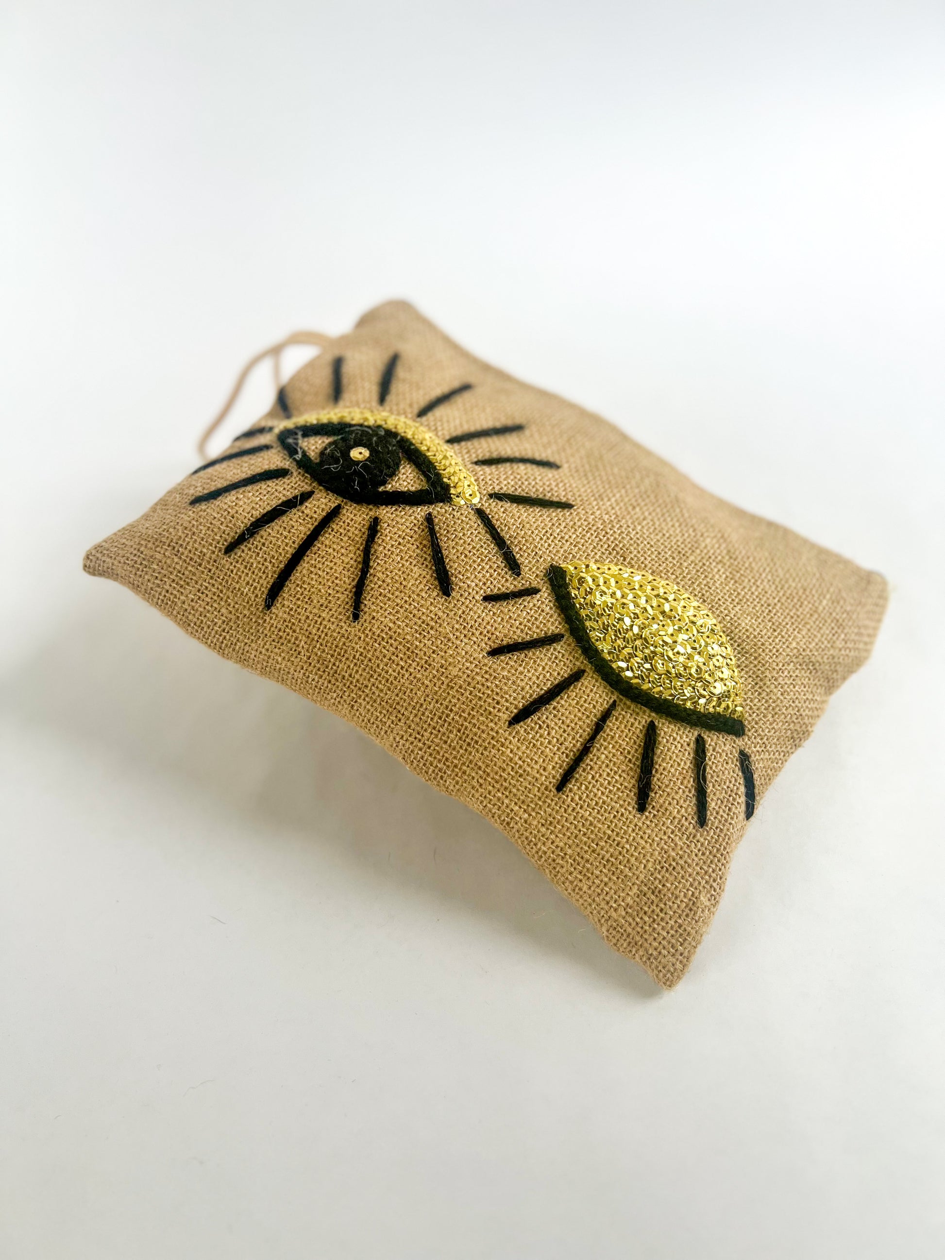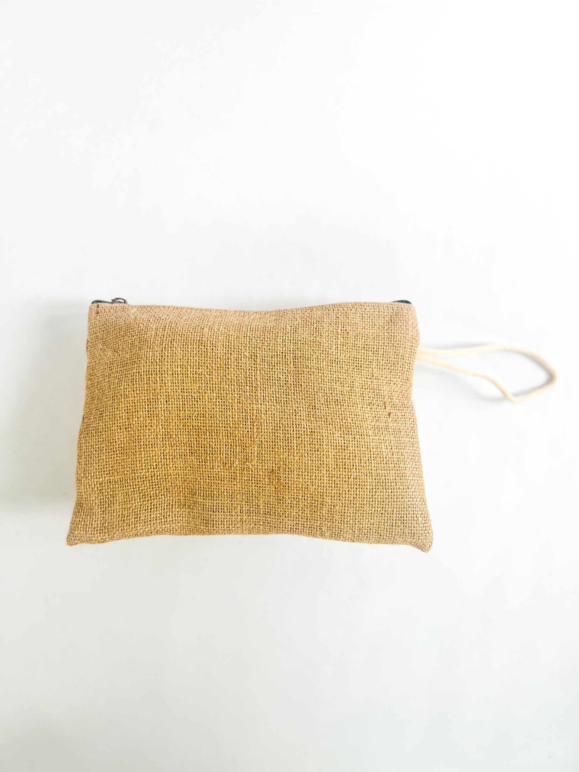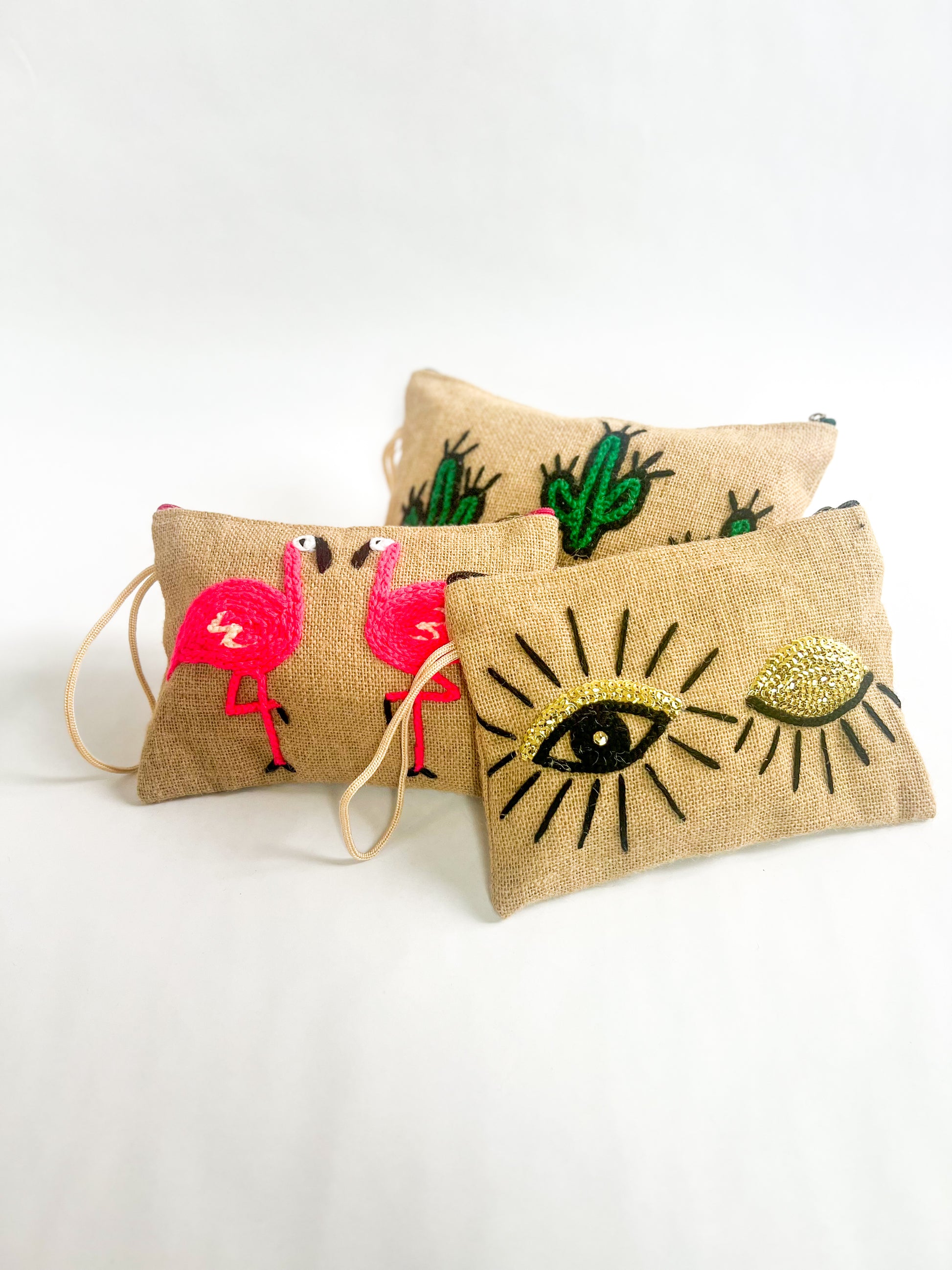 Experience the ultimate expression of your individuality with our handcrafted burlap "Wink" wrist bag. This one-of-a-kind bag exudes a charming and whimsical charm that is sure to elevate any ensemble. Its playful wink motif and luxurious burlap fabric make for a standout statement piece.