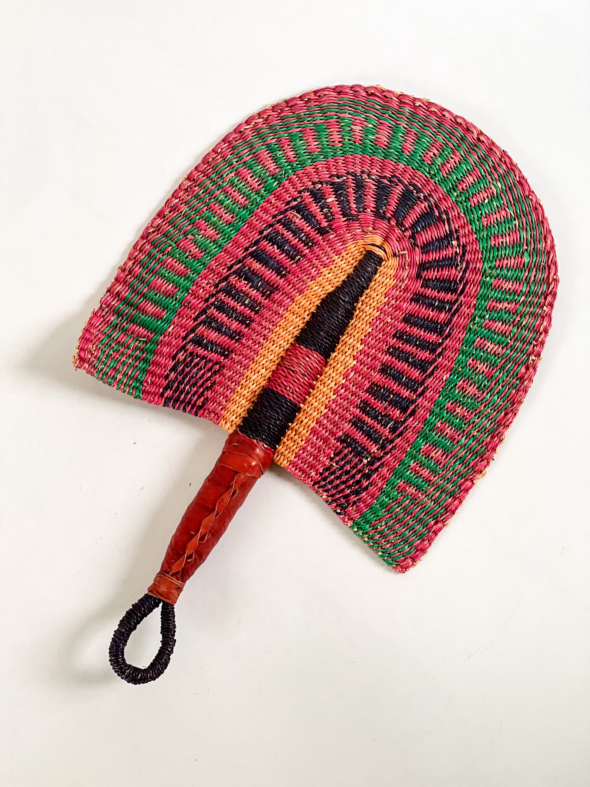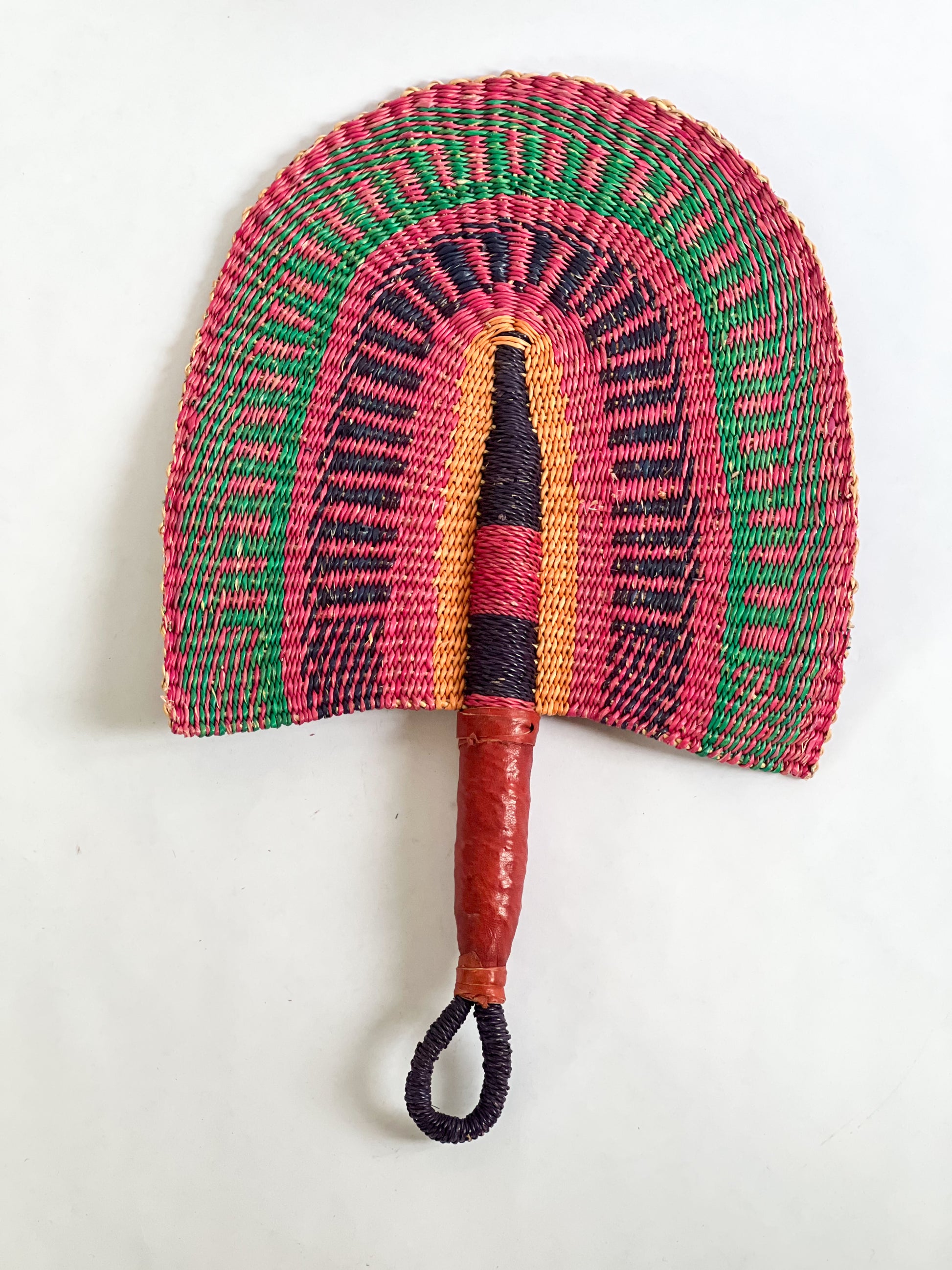 Handmade, woven fan for gallery wall. Can also be used to cool yourself on the beach, stoke a fire or charcoal, or as a fun accessory. Add texture and color to your collection of Moroccan handmade products.