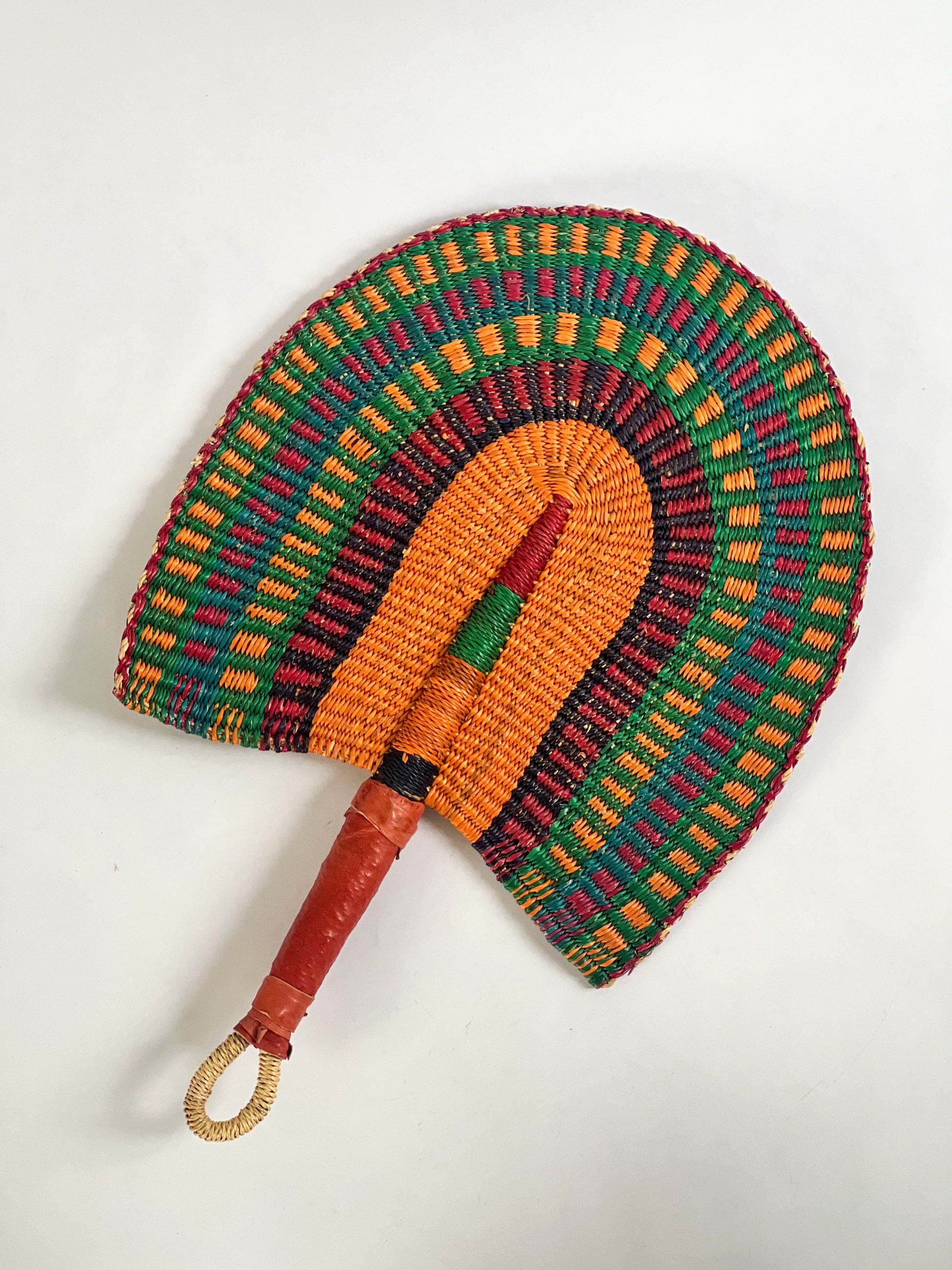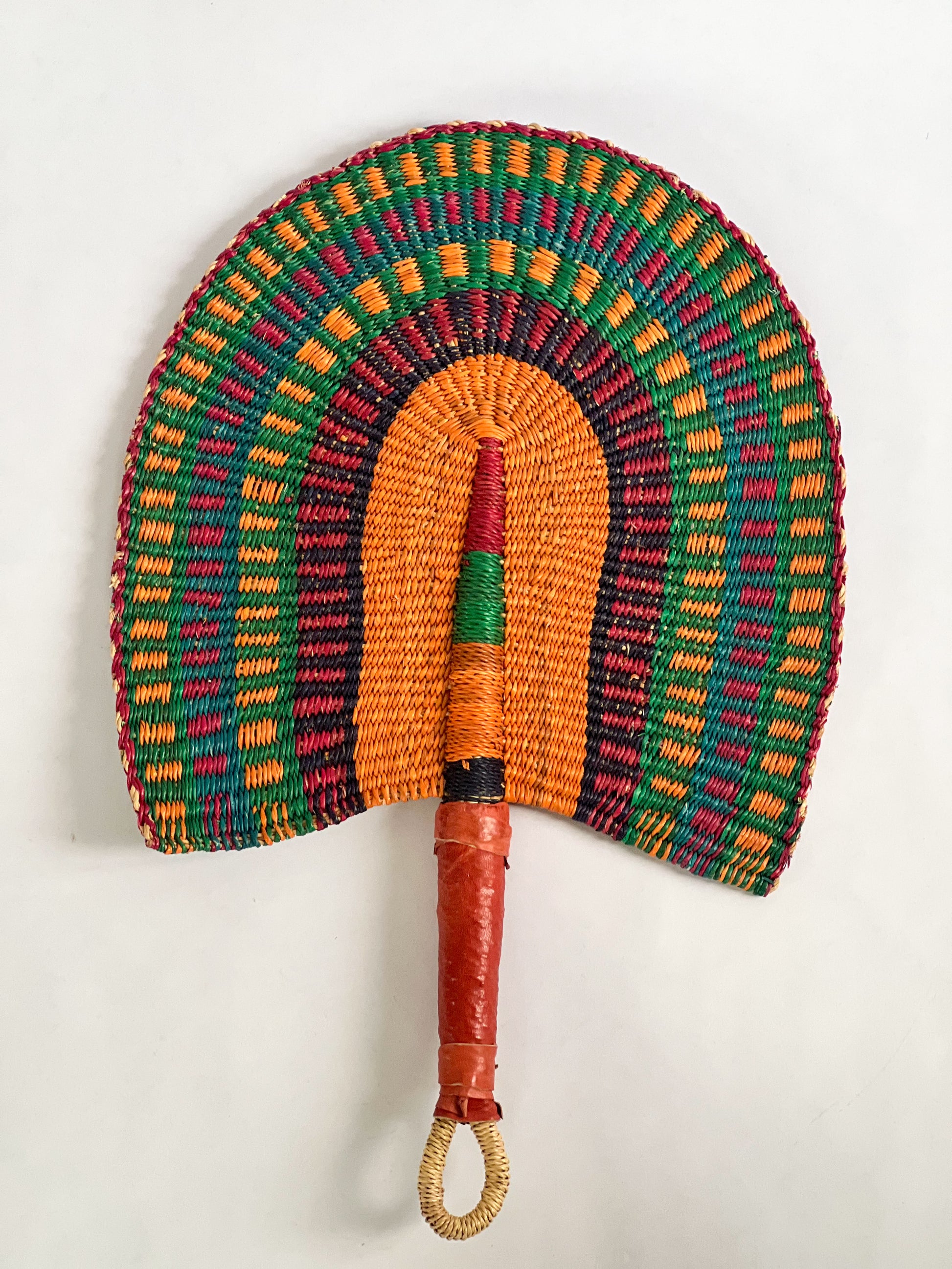 Handmade, woven fan for gallery wall. Can also be used to cool yourself on the beach, stoke a fire or charcoal, or as a fun accessory. Add texture and color to your collection of Moroccan handmade products.